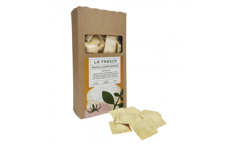 Nuestro Ravioli cuatro quesos es una pasta rellena elaborada artesanalmente, no contiene aditivos ni preservantes artificiales. Lo puedes encontrar en nuestras sucursales en presentación de 500 gramos.